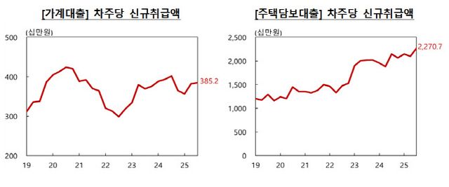 한국은행이 22일 발표한 ‘차주별 가계부채 통계 편제 결과’에 따르면 2025년 3분기 차주당 가계대출 신규취급액은 평균 3852만원으로 전 분기보다 26만원 증가했다. 감소세를 보이던 가계대출 신규취급액이 2분기부터 다시 늘어나며 완만한 증가 흐름을 이어간 것이다. 이 가운데 주담대 신규취급액은 2억 2707만원으로, 전 분기 대비 1712만원 급증했다.