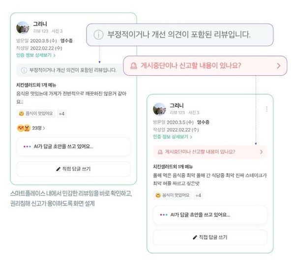 네이버는 AI가 리뷰 내용을 이해해 부정적인 톤의 리뷰를 선별해내고 적절한 대응을 제안할 수 있도록 표현에 대한 민감도를 고도화했다고 밝혔다. 모델 경량화를 통한 응답 속도 단축, 답글 문체 및 길이 맞춤화 등 기능도 업데이트했다.