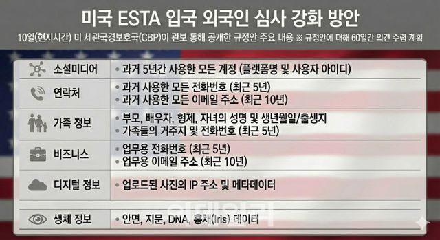 미국 세관국경보호국(CBP)은 지난 10일(현지시각) 한국·영국·일본 등 비자면제프로그램(VWP) 가입 42개국 국민이 무비자 전자여행허가(ESTA)를 신청할 때 최근 5년간 사용한 SNS 계정 정보와 지난 10년간 사용한 이메일 계정도 제출하도록 하는 규정을 예고했다. 이번 공지는 미국 연방관보를 통해 게재됐으며, 60일간 의견 수렴을 거친 뒤 예산관리국(OMB) 승인을 받아야 실제 시행이 가능하다. 의견 제출 마감은 내년 2월 9일까지다.