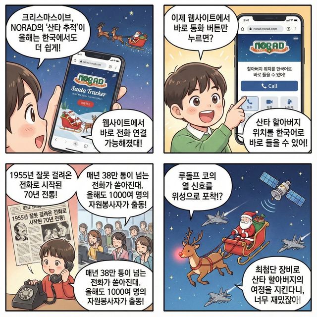 그동안은 북미 지역 주민들이 미국 전화번호(1-877-446-6723)로 연결되는 전용 ‘핫라인’에 전화를 걸어 산타의 위치를 문의하는 방식이 중심이었다. 올해는 한국에서도 웹사이트를 통해 전화로 음성 안내를 들을 수 있어 접근성이 한층 좋아졌다. 전화 안내는 크리스마스이브 일정 시간대에 맞춰 운영되는 방식이라, 산타 추적이 본격 시작되는 성탄 전야에 맞춰 이용하면 된다.