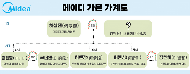 장남 허졘펑(何剑锋)은 메이디의 이사회 임원으로 활동하는 동시에 메이디그룹의 부동산 계열사인 메이디 리얼에셋의 핵심 임원으로 재직 중이다. 메이디 리얼에셋의 최대주주는 81.13%의 지분을 보유한 허졘펑의 배우자 루더옌(卢德燕)이다. 장녀인 허쳰장(何倩嫦)은 석유화학 기업인 후이통 신소재 유한회사 지분 30.61%를 직접 보유한 동시에 이사회 임원으로 활동하고 있다. 후이통 신소재 유한회사는 메이디의 신소재 개발 부문에서 독립해 설립된 기업으로 정관상 메이디그룹의 계열사는 아니지만 허쳰장이 최대주주인 만큼 사실상 그룹사로 봐도 무방하다. 회장인 리젠이(李健益) 역시 메이디 운영 관리부서 책임자 출신이다.