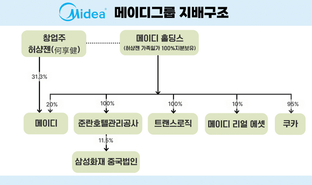 삼성재산보험 지분을 인수한 준란호텔관리유한공사는 메이디홀딩스의 호텔 부문 자회사다. 메이디홀딩스는 창업주 허샹젠(何享健)과 그의 가족들이 100% 지분을 보유한 회사로 그룹 지배구조의 정점에 자리하고 있다. 다만 가족 구성원별 구체적인 지분율은 베일에 가려져 있다. 메이디홀딩스의 주요 자회사로는 ▲메이디(가전 제조·판매사) ▲준란호텔관리유한공사(호텔 운영·관리 법인) ▲트랜스로직(물류 자동화 솔루션 자회사) ▲메이디 리얼에셋(부동산 개발) ▲쿠카(로봇 제조사) 등이 있다.