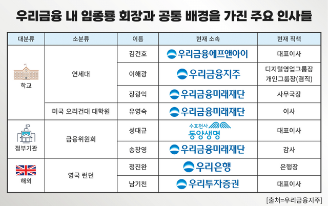 현재 우리금융 핵심 요직에는 임 회장 인맥 네트워크의 한 축을 차지하는 연세대·오리건대 출신 인사들이 다수 포진해 있다. 임 회장은 지난 2023년 3월 취임 직후 단행한 인사에서 연세대 출신 인사들을 핵심 요직에 중용했다. 미래사업추진부문장(상무)에는 김건호 전 우리금융 시너지추진부 본부장을, 경영지원부문장(본부장)에는 이해광 전 부산서부영업본부장을 각각 발탁했다. 이후 올해 초 인사에서 김 본부장은 다시 우리금융에프앤아이 대표로, 올해 말 인사에서 이 본부장은 지주사 디지털영업그룹장 역할에 더해 개인그룹장을 겸직하게 됐다.