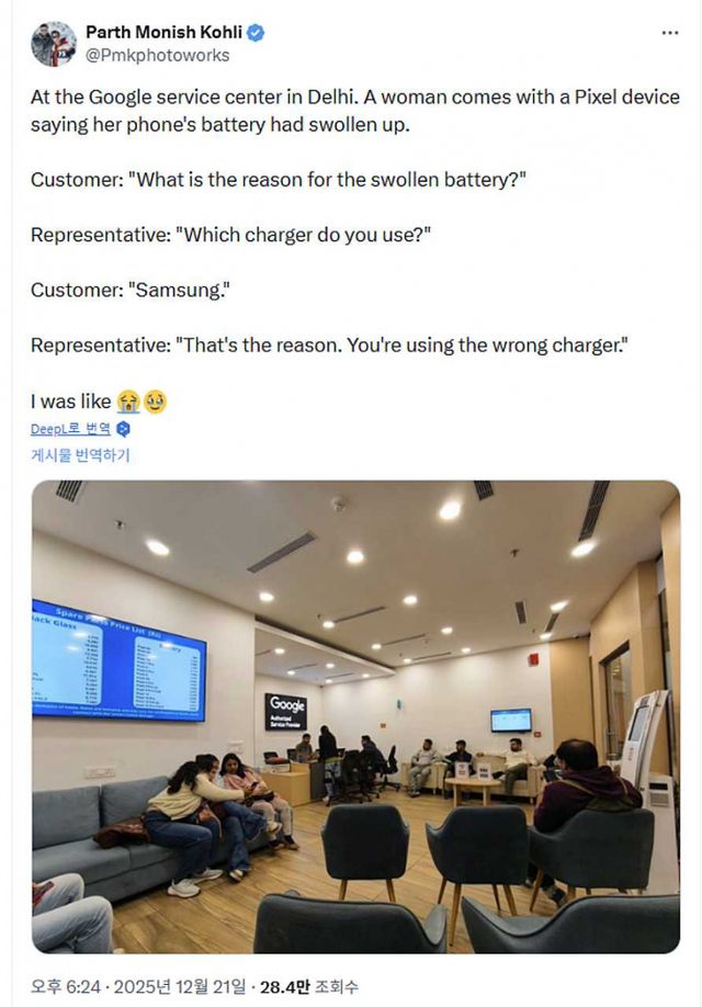 사례는 인도 델리에 위치한 구글 서비스센터에서 발생했다. X 이용자인 pmkphotoworks는 현장에서 한 여성 고객과 서비스센터 직원의 대화를 우연히 듣게 됐다고 전했다. 배터리가 부풀어 오른 픽셀 스마트폰을 들고 방문한 고객이 원인을 묻자, 직원은 먼저 어떤 충전기를 사용했는지 되물었다.