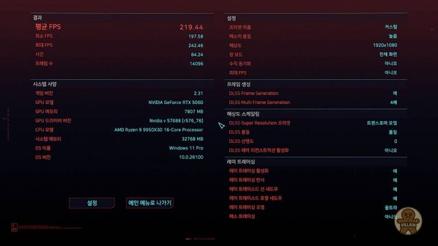 ▲ PALIT RTX 5060 DUAL OC 8GB DLSS 품질, 프레임 생성 4x 결과. 이 정도면 240Hz 모니터에서도 쾌적하게 즐길 수 있다.