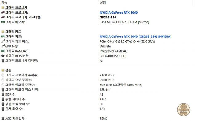 아키텍처 : NVIDIA Blackwell GB206 (GeForce RTX 5060)