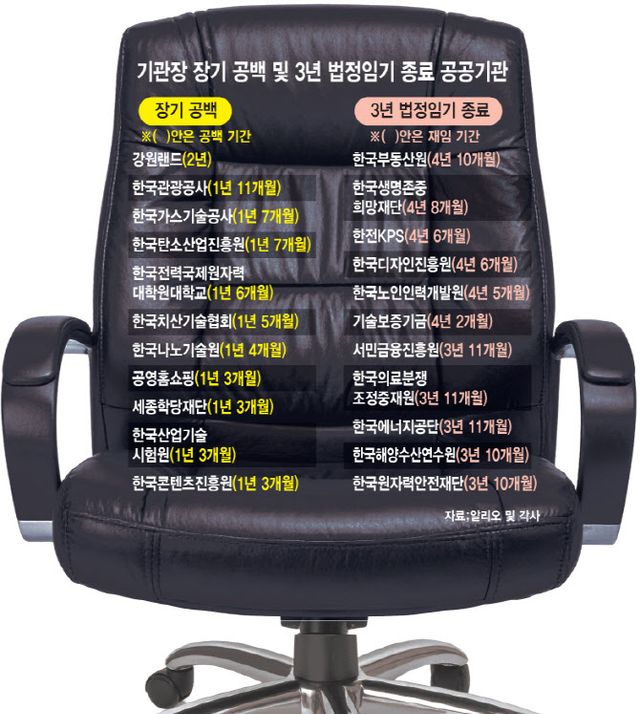 22일 이데일리 집계에 따르면 현재 344개 공공기관 중 47곳이 기관장 없이 대행 체제로 운영 중이다. 강원랜드·관광공사처럼 1년 이상 공석인 채로 방치된 곳도 11곳에 이른다. 여기에 더해 43곳은 이미 기관장 임기가 끝났거나 수일 내 끝난다. 전체의 27%에 이르는 90곳이 사실상 공백인 셈이다.