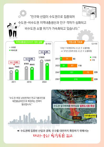 대전·충남 통합론 대두 배경은 서울과 경기를 중심으로 한 수도권 집중현상은 갈수록 심화하면서다. 또 대전을 비롯한 충남 대부분의 도시에서 인구 감소 및 청년 유출이 심각한 문제로 대두됐다.
