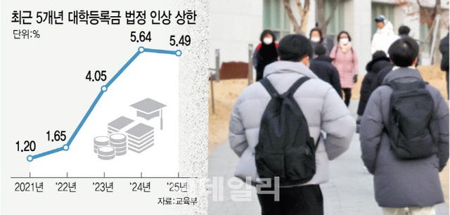 통계청에 따르면 최근의 물가상승률은 2023년 3.60%, 2024년 2.30%로 하향 추세다. 여기에 한국은행은 지난 11월 올해 소비자 물가 상승률을 2.10%로 전망했다. 직전 3개(2023~2025년) 연도 소비자 물가상승률의 평균은 2.67%로 대학 등록금은 1.2배인 3.20%까지 인상이 가능할 전망이다.