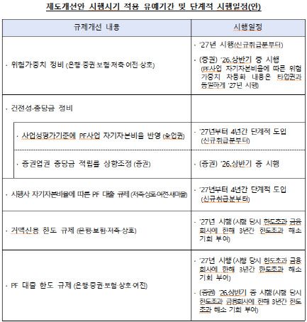 저축은행·상호금융·여전사·새마을금고 등에 대해서는 PF 대출 시 PF 사업비 대비 자기자본비율 요건을 단계적으로 적용한다. 1년의 유예기간을 두고 2027년 5%에서부터 시작해 2030년 20%까지 상향한다. 이 기간 중에는 최초 취급 시점에 적용되는 자기자본비율 기준을 사업 종료 시까지 적용토록 할 예정이다.