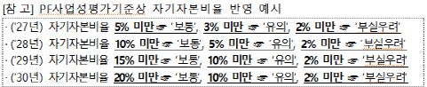 건전성·충당금 규제도 정비한다. PF 사업성 평가 시 손실흡수능력을 평가해 PF사업 자기자본비율 등에 따라 건전성 분류와 충당금을 차등화하기로 했다. 다만 현재 국내 시행사 자기자본비율 수준(3%)을 감안해 유예기간 1년을 거쳐 2027년부터 4년간 단계적으로 비율을 상향한다.