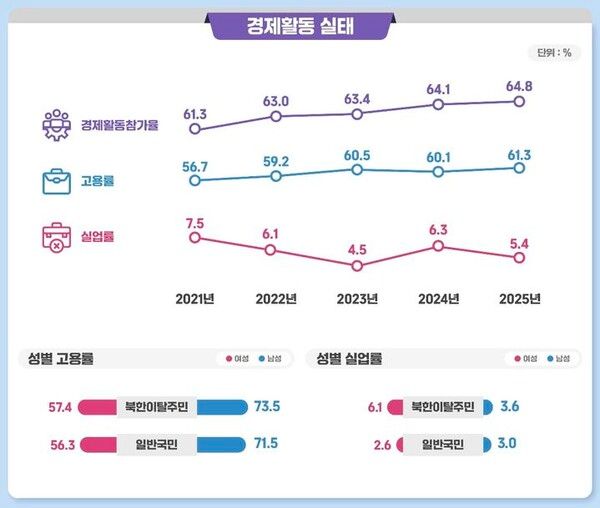 뉴시스 보도에 따르면, 하나재단이 23일 공개한 2025년 '북한이탈주민 실태조사' 결과를 보면 남한생활에 '만족한다'는 응답은 81.2%로 전년대비 1.6%포인트 높아졌다. 이는 2011년부터 조사를 실시한 이후 가장 높은 수치다.