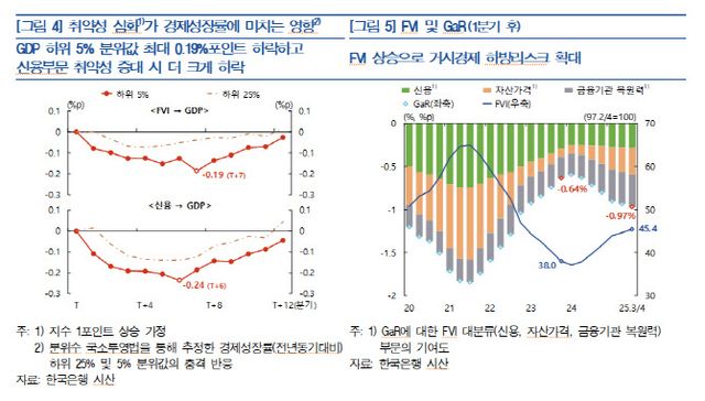 금융취약성 확대는 실물경제 하방 위험과도 연결됐다. 금융취약성지수가 1포인트 상승할 경우, 경제성장률의 하위 5% 분위값은 최대 0.19%포인트 하락하는 것으로 추정됐다. 특히 신용 부문의 취약성이 증대될 경우 거시경제 하방 위험이 더욱 확대돼, 6분기 후 성장률 하위 위험이 -0.24%포인트까지 하락하는 것으로 나타났다.