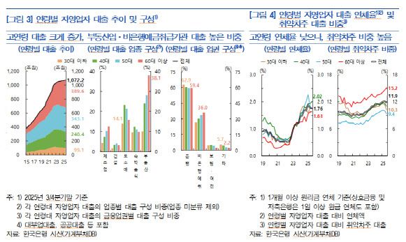 다만 한은은 고연령 자영업자에 대해 잠재 리스크가 누적되고 있다고 분석했다. 고연령층의 취약 자영업자 대출 비중은 15.2%로 다른 연령대보다 높고, 최근에도 상승세를 이어가고 있다. 향후 부동산 경기 변동이나 충격이 발생할 경우, 고연령 취약 차주를 중심으로 연체율이 빠르게 높아질 가능성이 있다는 지적이다.