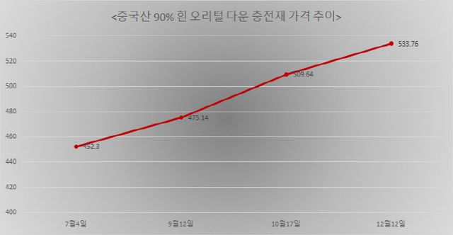 23일 중국우모정보망에 따르면 패딩에 쓰이는 중국산 흰 오리털 다운 충전재(90% 함량) 가격은 지난 12일 기준 kg당 553.76위안(한화 약 11만 6000원)을 기록했다. 지난 9월(470위안 기준)과 비교하면 17%가량 오른 셈이다. 최근 중국내 다운 충전재 무역상들 사이에선 kg당 640위안(약 13만 4000원) 이상을 요구하는 경우도 있는 것으로 알려졌다.