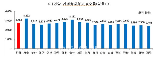 전국 17개 시·도별로 보면, 서울의 1인당 개인소득이 3222만원으로 1년 전(3038만원)보다 184만원(6.06%) 증가해 가장 높았다. 2016년부터 9년 연속 1위를 차지한 것이다. 전국 평균과 비교하면 15.8%나 높았다. 서울 외에도 울산(3112만원), 대전(2875만원), 세종(2838만원), 경기(2791만원)의 1인당 개인소득이 전국 평균을 넘어섰고, 그 중 울산은 사상 처음으로 3000만원을 넘겼다.