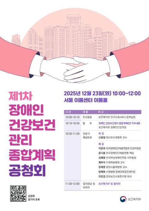[와이뉴스] 보건복지부는 12월 23일 오전 10시 서울 여의도 이룸센터에서 ‘제1차 장애인 건강보건관리 종합계획(안)’에 대한 공청회를 개최했다.