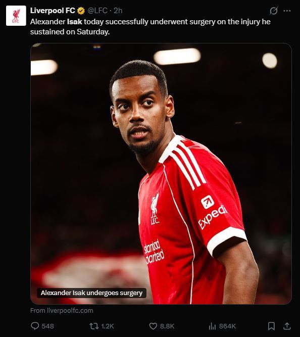 'BBC'는 "모하메드 살라는 아프리카 네이션스컵 참가로 팀을 떠나 있고, 코디 각포 역시 부상 중인 상황에서 이삭의 이탈은 공격 옵션을 더욱 제한한다"고 지적했다.