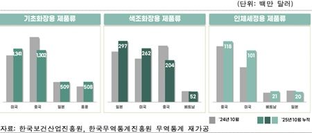 (그래프)화장품 주요 품목 수출액 변화(2025년 10월 누적)