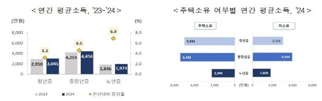 특이한 점은 주택 소유 여부에 따른 청년층의 소득 격차다. 주택을 보유한 청년층의 연 소득은 5034만원으로, 무주택 청년층(2721만원)의 약 1.9배에 달했다. 중장년층과 노년층 주택 보유자의 소득은 무주택자보다 각각 1.5배, 1.4배 높았다.