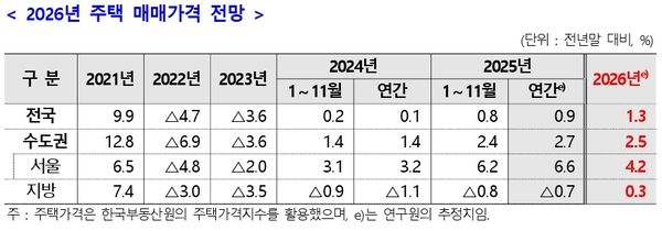 내년 집값은 권역별로 수도권과 지방이 각각 2.5%, 0.3% 상승할 것으로 전망된 가운데 전국 주택 시장의 바로미터인 서울은 4.2% 오를 것으로 예상됐다.