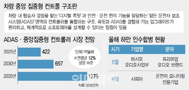 하만 최고경영자(CEO) 겸 오토모티브 사업부문 크리스천 소봇카 사장은 “이번 인수로 ADAS 사업을 하만의 제품 포트폴리오에 추가해 전장시장에서 중앙집중형 통합 컨트롤러를 공급할 수 있는 전략적 발판을 마련했다”며 “하만의 전장 전문성과 삼성의 IT 기술 리더십을 결합할 것”이라고 강조했다. ADAS와 중앙집중형 컨트롤러 시장은 올해 약 422억달러(약 62조 5000억원)에서 2030년 657억달러, 2035년 1276억달러(약 189조원) 규모로 성장할 전망이다. 연간 12%씩 급성장하는 수준이다.