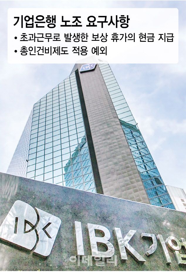 기업은행 노조는 이 보상 휴가를 현금으로 지급하라고 요구하고 있다. 기업은행 노조에 따르면 지난해 기준 노동자 1명당 사용하지 못한 보상휴가 일수는 약 35일 정도다. 이를 수당으로 환산하면 1명당 약 600만원, 전체 규모는 약 780억원에 달한다.