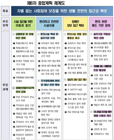 제6차 계획은 ▲시설 접근을 위한 이동권 증진 ▲편리하고 안전한 시설 이용 보장 ▲장애인의 정보 접근 확대 ▲편의 관련 제도 기반 정비의 4대 추진전략을 중심으로 구성됐다.