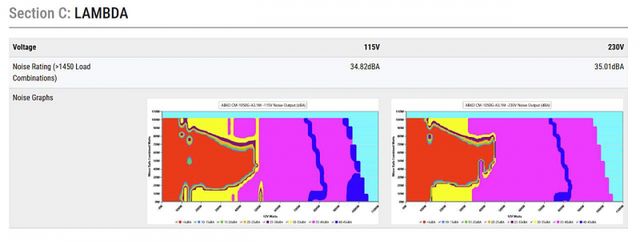 측정 결과는 CM-1050G의 소음 특성이 출력 증가에 따라 반응하는 방식임을 의미한다. 측정된 평균 소음 수치는 115V에서 약 34.8dBA, 230V 기준 약 35.0dBA로, LAMBDA STANDARD+ 등급에 해당한다. 이는 정숙형 설계를 전제로 한 제품이라기보다는, 출력 안정성과 냉각 여유를 우선한 소음 특성으로 해석할 수 있다.