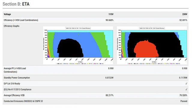 반면, Cybenetics는 파워의 출력 전 구간에 걸쳐 수천 개 이상의 조합으로 부하를 테스트한다. 효율 자체도 80PLUS보다 높은 수준이다. 참고로 ETA PLATINUM 인증을 획득하려면 전 출력 구간의 평균 효율이 약 91%~93% 사이에 위치해야 한고, ETA GOLD 인증은 약 89% ~ 91% 사이 구간을 사수해야 한다. 특정 구간에서의 효율이 살짝만 떨어져도 인증은 아래단계로 내려가게 된다.