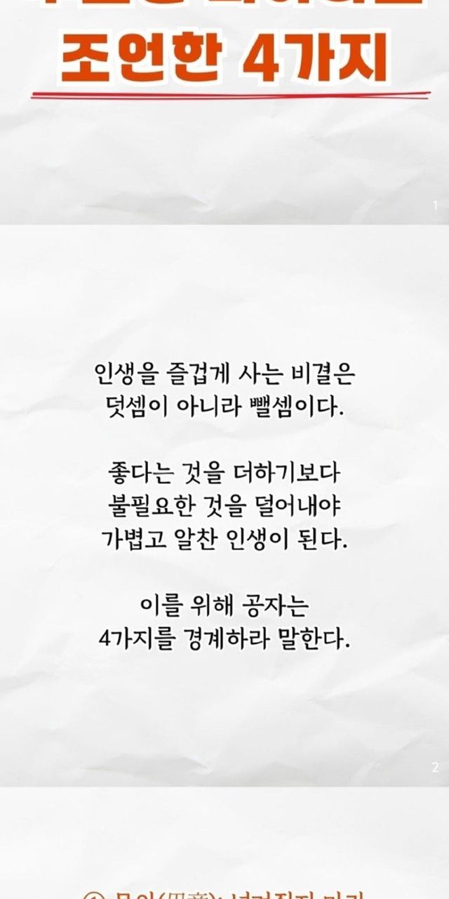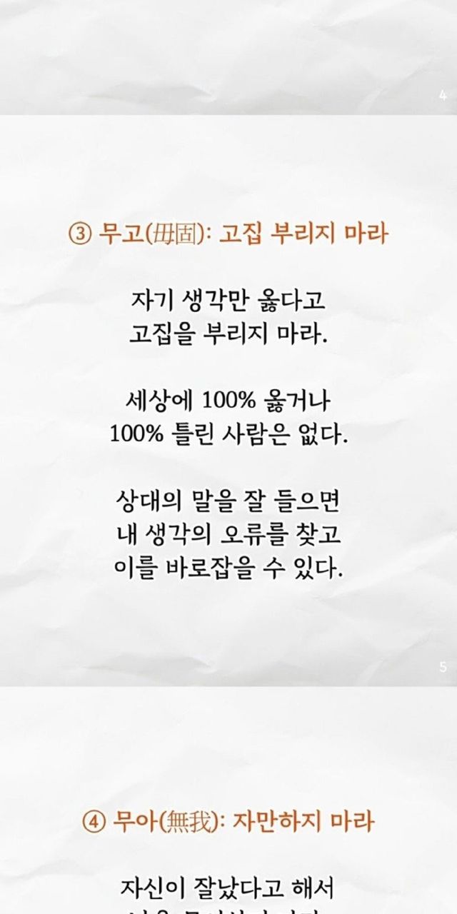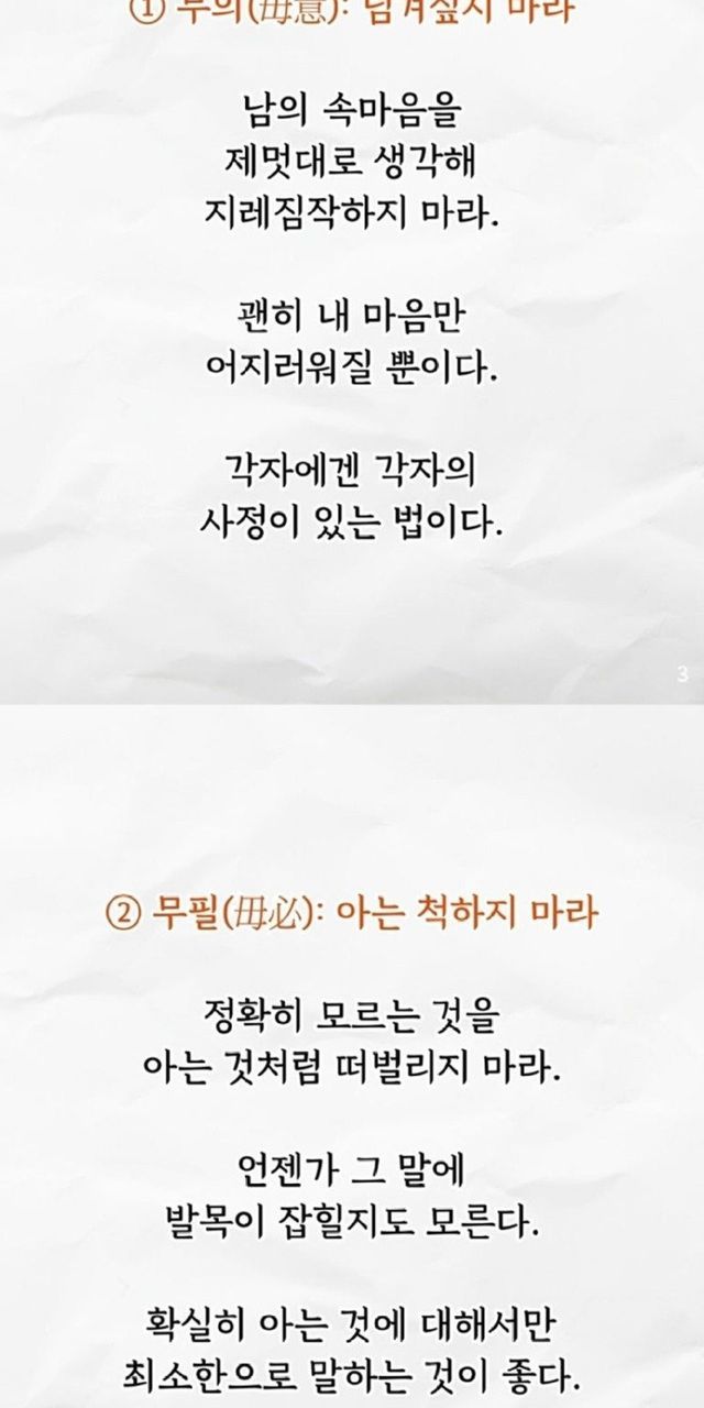 동양 최고의 철학자로 일컬어지는 공자는 우리가 피해야 할 4가지를 제시했어요. 이 4가지를 잘 이해하고 실천한다면, 더 가볍고 알찬 인생을 살 수 있을 겁니다. 공자의 말을 다시 정리해 봤는데요.
