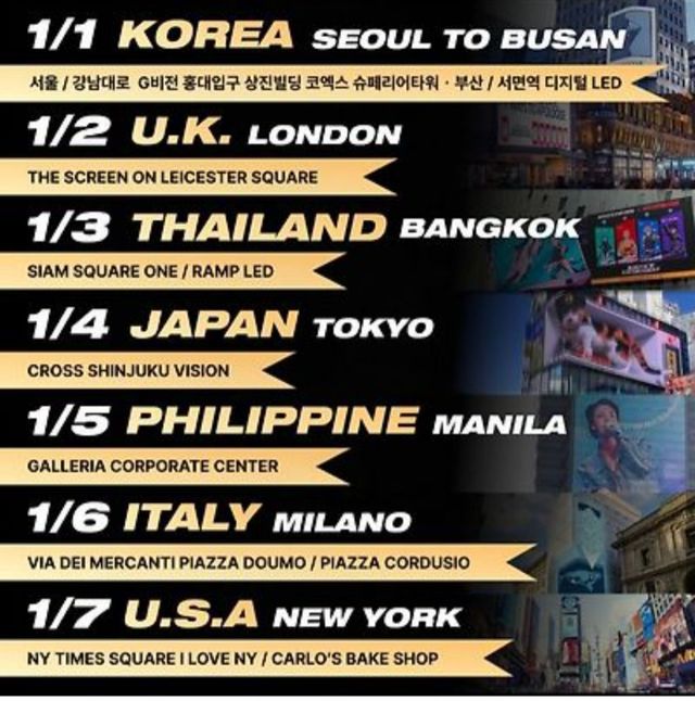 이어 1월 2일 영국 런던 레스터 스퀘어, 1월 3일 태국 방콕, 1월 4일 일본 도쿄 신주쿠, 1월 5일 필리핀 마닐라, 1월 6일 이탈리아 밀라노, 1월 7일 미국 뉴욕 타임스퀘어까지 전 세계 주요 도시에서 프로젝트가 이어진다. 서울에서 시작된 무대의 여운이 세계로 뻗어나가는 것이다.