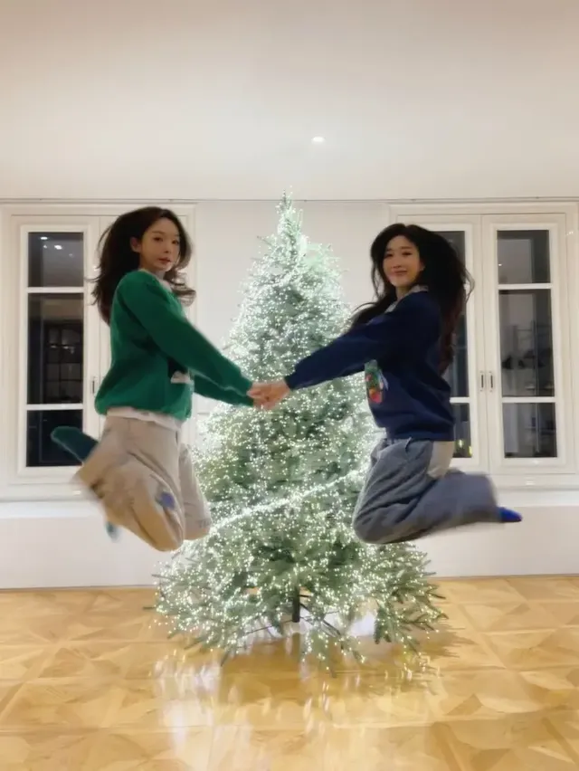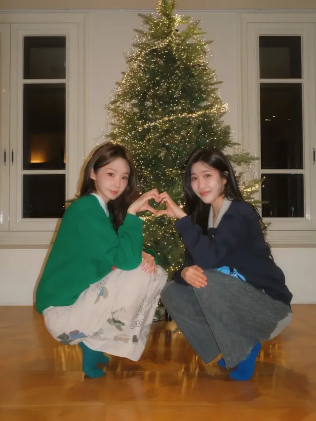 공개된 사진 속 두 사람은 대형 크리스마스트리를 배경으로 연말 분위기가 물씬 풍기는 홈 파티를 즐기는 모습이다. 강민경과 이해리는 각각 녹색과 남색의 캐릭터 스웨터를 착용하고 장난기 넘치는 포즈를 취하며 돈독한 팀워크를 드러냈다.