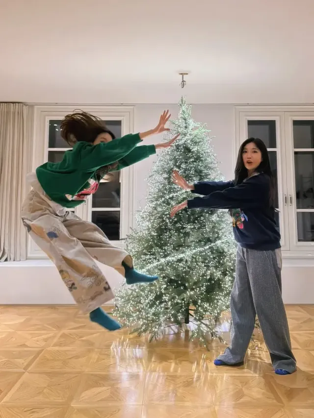 특히 두 사람은 트리 앞에서 공중으로 뛰어오르거나 서로를 끌어안는 등 역동적인 장면을 연출해 시선을 모았다. 정적인 기념사진 촬영을 넘어 점프샷과 하트 포즈를 시도하며 현장의 유쾌한 분위기를 고스란히 담아냈다.