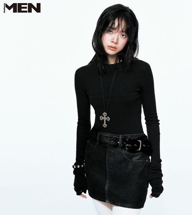 니트 톱 Sacai, 데님 스커트 Isabel Marant, 스타킹 Shop Cider, 크로스 모티브 네크리스와 레더 브레이슬릿, 링 모두 Chrome Hearts, 퍼 벨트 Dries Van Noten.