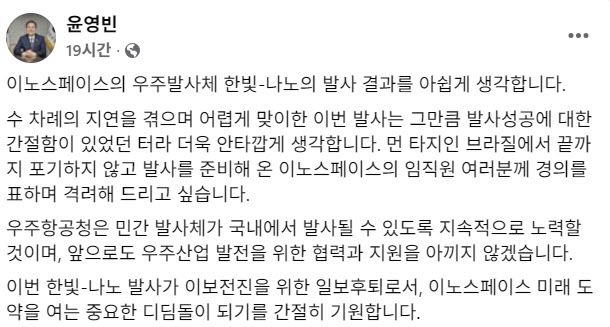 윤영빈 우주항공청장은 전날 페이스북 게시글을 통해 “수 차례 지연을 겪으며 어렵게 맞이해 발사성공에 대한 간절함이 있었기 때문에 안타깝게 생각하며, 먼 타지에서 끝까지 포기하지 않고 발사를 준비해 온 이노스페이스 임직원 여러분께 경의를 표한다”고 전했다.