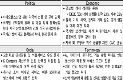진흥원은 2026년 바이오헬스산업 수출 환경을 PEST(정치·경제·사회·기술) 관점에서 분석했다.