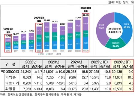 2026년 바이오헬스산업은 미국 신정부의 보호무역주의, 각국의 규제 강화 등 불확실성 속에서도 북미·유럽 중심의 수출 확대와 신흥 시장 다변화로 처음으로 300억 달러를 돌파할 전망이다.