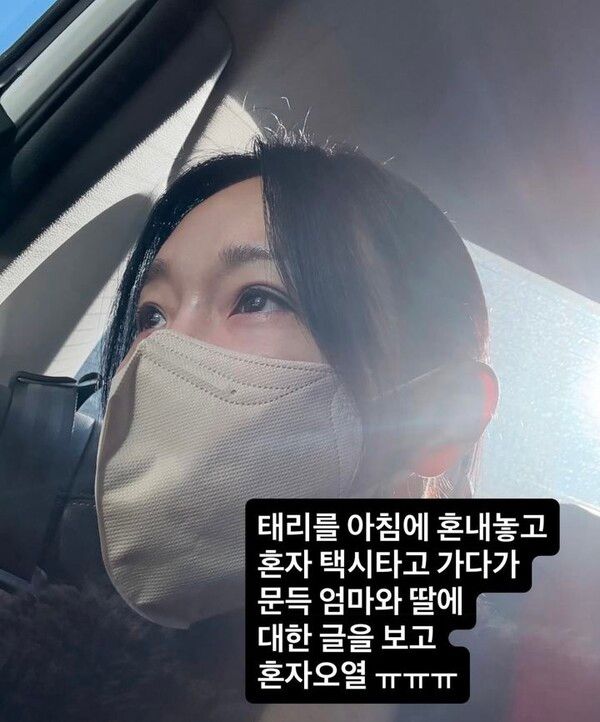 뉴시스 보도에 따르면, 그는 지난 23일 소셜미디어에 "태리를 아침에 혼내놓고 혼자 택시타고 가다가 문득 엄마와 딸에 대한 글을 보고 혼자 오열"이란 글과 함께 사진 여러 장을 올렸다.