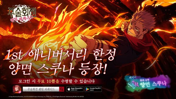 이번 업데이트를 통해 1주년 한정 SSR 캐릭터 [화력 승부] 양면 스쿠나와 [드러난 영혼] 마히토가 새롭게 등장한다. 양면 스쿠나는 24일 15시부터 2026년 1월 22일 14시 59분까지, 마히토는 2026년 1월 4일 15시부터 1월 22일 14시 59분까지 픽업 소환을 통해 획득할 수 있다.