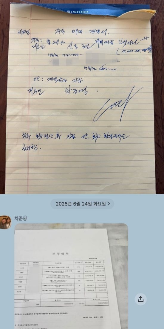 MC몽이 공개한 사진에는 자필로 작성한 듯한 MC몽과 차 씨의 주식 매매 계약서, 차 씨가 보냈다는 메시지, 그리고 차가원 대표와 나눈 개인 대화 캡처가 담겼다.