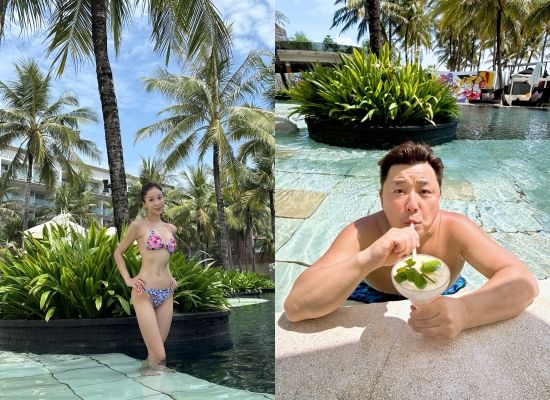 사진 속에는 인도네시아 발리 신혼여행에서 즐거운 한때를 보내고 있는 윤정수 원진서 부부의 모습이 담겨 있다. 원진서의 늘씬한 비키니 자태와 27kg 감량 다이어트에 성공한 윤정수의 상의 탈의 모습이 눈길을 끈다.