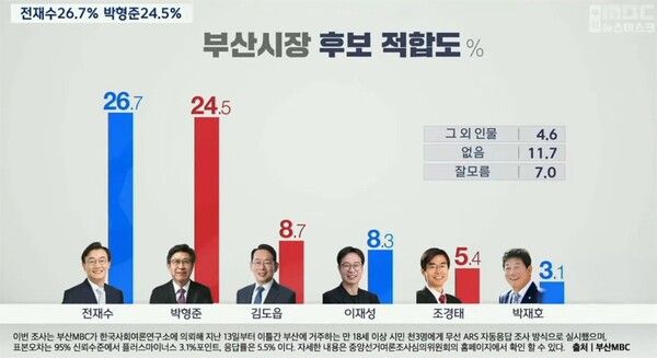부산시장 후보 적합도 조사 결과 전재수 26.7%, 박형준 24.5%였다.