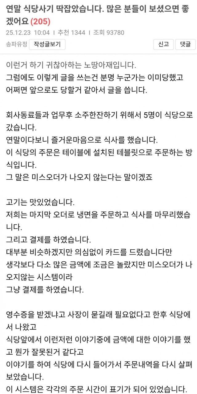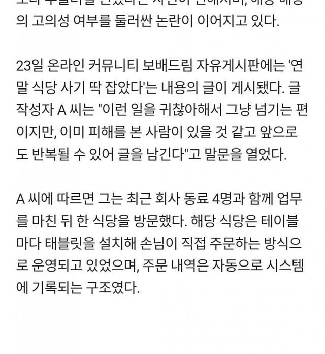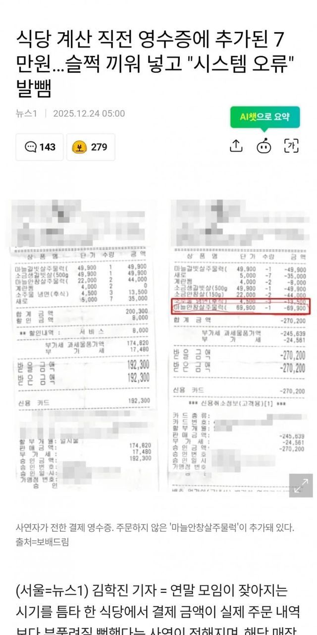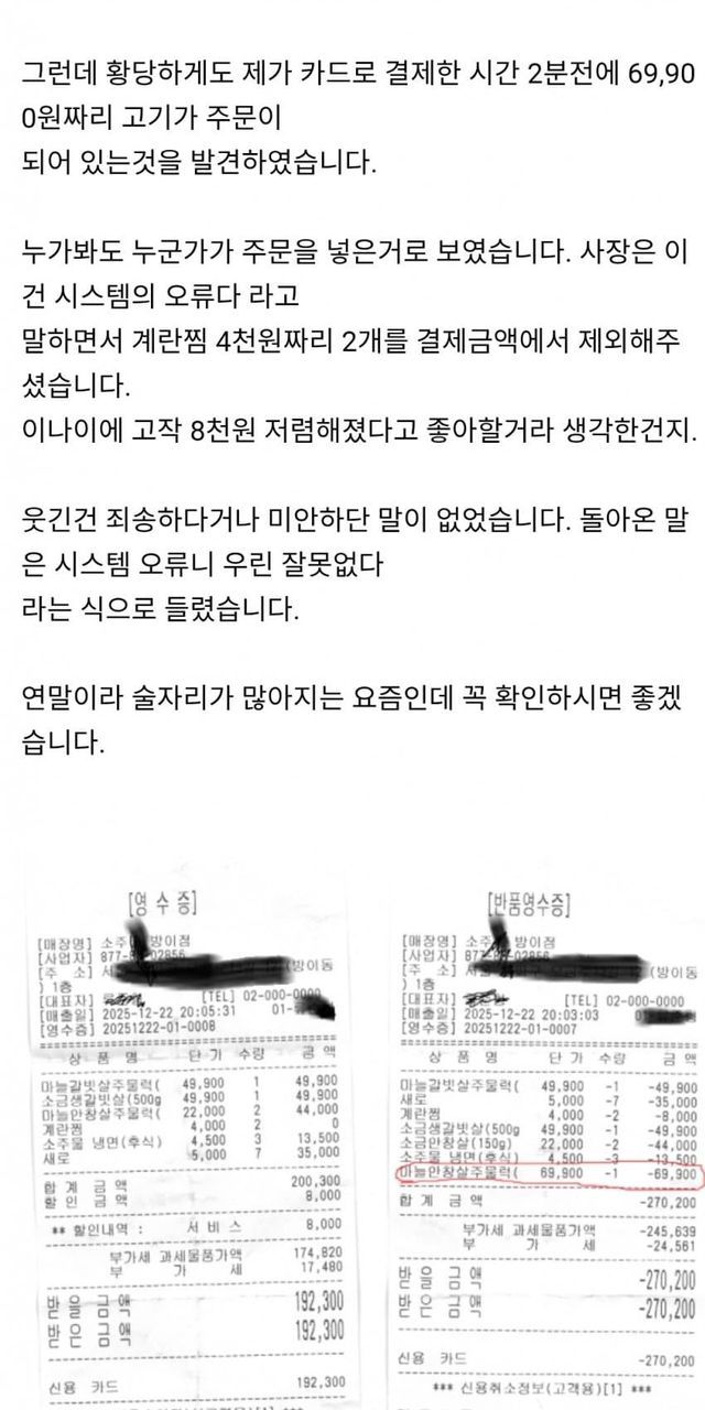 식당 계산 직전 영수증에 추가된 7만원…끼워 넣고 "시스템 오류"