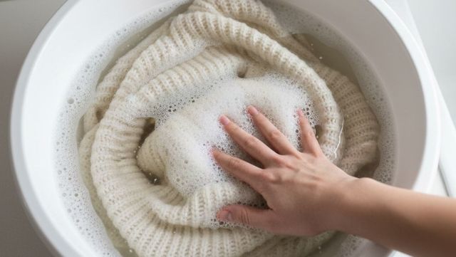 이제 줄어든 니트를 린스 물에 완전히 잠기도록 담근다. 이때 손으로 강하게 주무르지 말고, 섬유 사이로 린스 물이 충분히 스며들 수 있도록 가볍게 눌러준다. 약 15분에서 20분 정도 그대로 방치한다. 이 시간 동안 린스 성분이 섬유의 스케일을 유연하게 만들어 엉킴을 해제할 준비를 마친다.