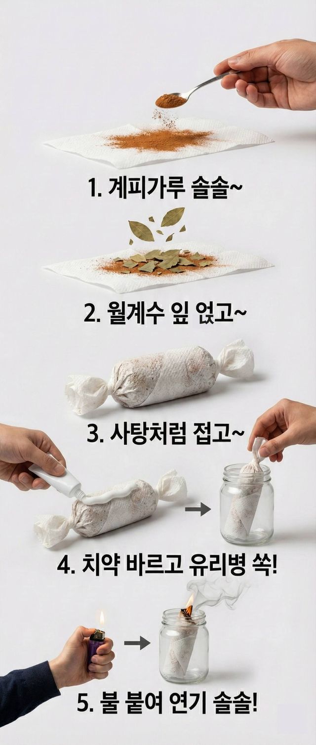 과정은 비교적 단순하다. 키친타월을 펼친 뒤 가운데에 계피 가루를 뿌리고, 잘게 부순 월계수 잎을 얹는다. 가루가 흘러내리지 않도록 양쪽을 꼬아서 고정시키는 사탕 모양으로 만든 다음, 겉면에 치약을 아주 얇게 바른다. 이렇게 만든 키친타월을 유리병 안에 넣고 끝부분을 심지처럼 노출시키는 방식이다. 이후 끝을 살짝 그을려 연기가 천천히 퍼지도록 한다는 설명이 뒤따른다.