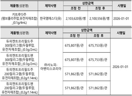 듀피젠트 프리필드주와 프리필드펜의 상한금액은 300밀리그램 제품의 경우 67만5,807원에서 67만 5,753원으로, 200밀리그램 제품은 57만 1,862원으로 조정됐다.