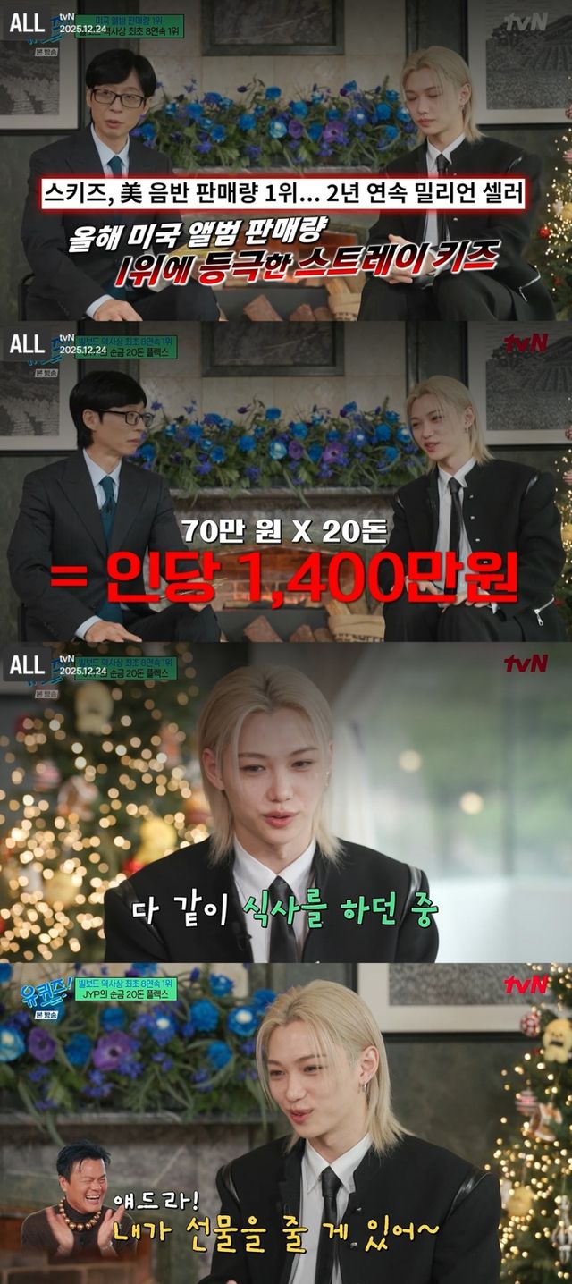 특히 이목을 모은 건 소속사 JYP엔터테인먼트 수장 박진영의 통 큰 선물이었다. 필릭스는 “식사 자리에서 박진영이 ‘선물 줄 게 있다’며 순금 20돈 기념패를 꺼냈다”며 “빌보드 1위 기념으로 제작된 것이라 포장도 굉장히 예뻤다”고 설명했다.