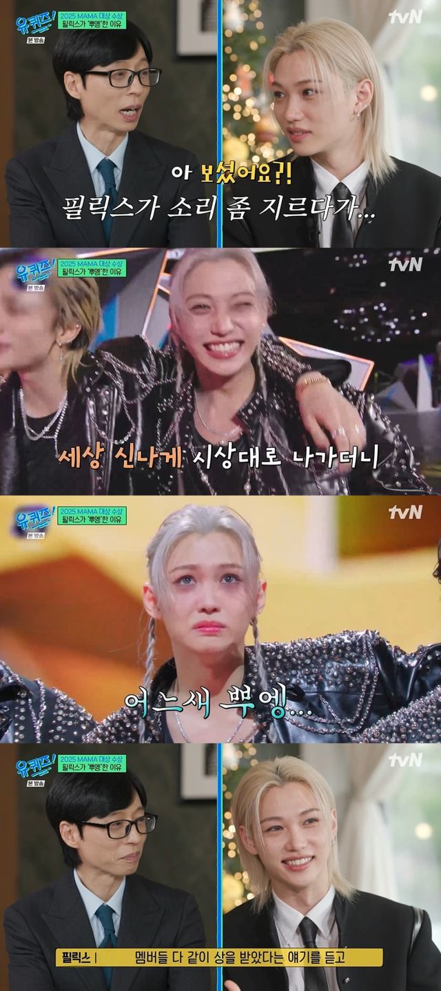24일 방송된 tvN ‘유 퀴즈 온 더 블럭’(이하 ‘유퀴즈’)에는 글로벌 그룹 스트레이 키즈의 필릭스가 출연해 솔직한 이야기를 전했다.이날 유재석은 “그때 소리 좀 지르다가 ‘뿌앵’ 하지 않았냐”며 ‘마마 어워즈’ 수상 소감을 떠올렸고, 필릭스는 머쓱한 웃음과 함께 당시를 회상했다.