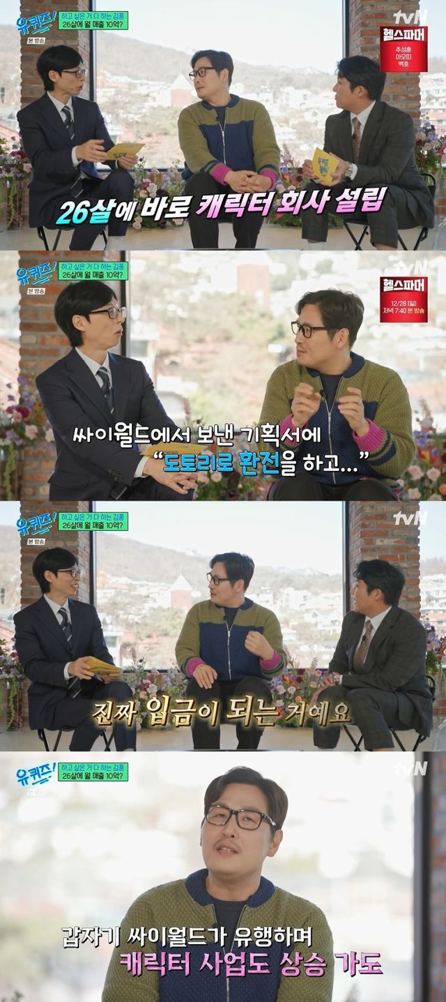 24일 방송된 tvN 예능 ‘유 퀴즈 온 더 블럭’(이하 ‘유퀴즈’)에 출연한 김풍은 젊은 시절 사업가로서 겪었던 성공과 좌절을 솔직하게 전했다. 그는 “26살 때 캐릭터 회사를 차렸다”며 “싸이월드가 막 시작하던 시기에 미니홈피 스킨과 미니미 캐릭터 제작 제안을 받았다”고 회상했다.